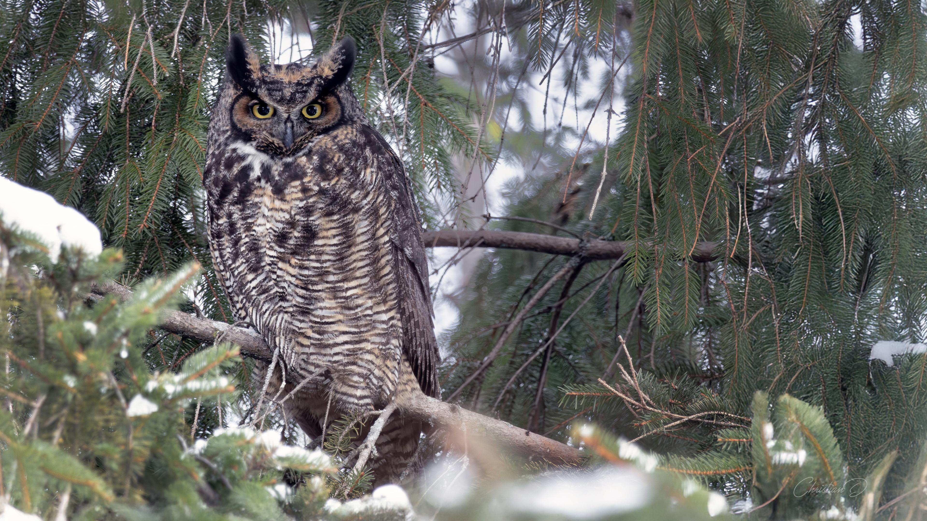 Grand-duc d’Amérique perché dans un conifère enneigé. Ses aigrettes dressées et son plumage cryptique en font un maître du camouflage hivernal.