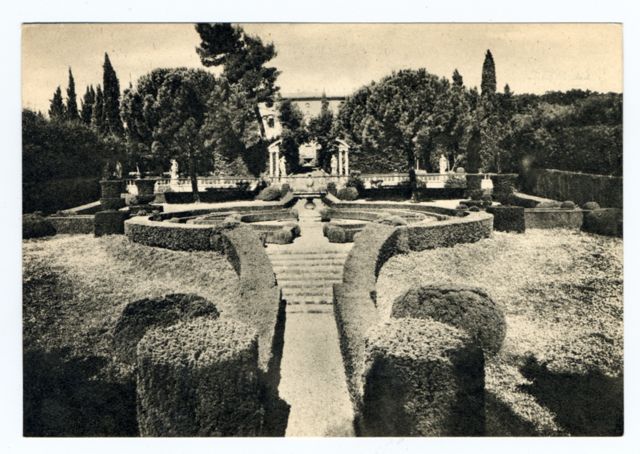 The image depicts a formal garden with meticulously maintained hedged pathways leading to the center where statues and architectural elements are arranged symmetrically. The scene is framed by tall trees, suggesting an enclosed or secluded space. This monochromatic photograph appears aged, indicating it may be historical in nature. It captures a sense of classical beauty associated with Italian villas from past centuries.