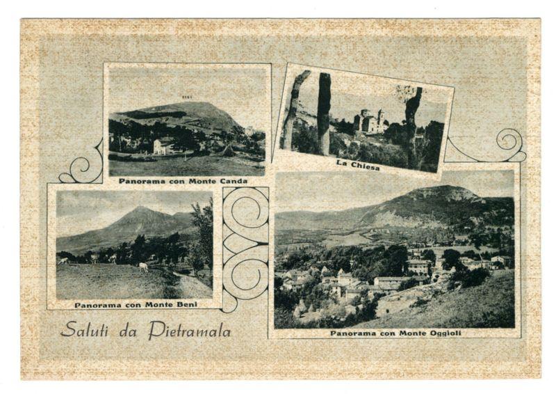 The image is a vintage postcard featuring four monochrome photographs, which are likely historical views of different scenic locations. The top left photo shows "Panorama con Monte Canda" with what appears to be an agricultural landscape and buildings in the distance under hilly terrain. Adjacent on the right side, labeled "La Chiesa," depicts a church-like structure amidst trees. Below these images is another scene titled "Panorama con Monte Beni." It displays mountainside views with structures that resemble farmhouses or rural residences surrounded by fields. The bottom left corner of this postcard features "Saluti da Pietramala" written in cursive script, indicating the sender's greeting from a place called Pietramala. The top right photo is labeled "Panorama con Monte Oggioi," illustrating a broader view with more buildings and what appears to be farmland or rural settlements at its base. The bottom edge of this postcard reads "Panorama con Monte Beni" again, suggesting it may have been initially mislabeled. The entire image has an aged paper texture overlay, adding to the historical feel of the presentation. A decorative swirl design is placed near the top right corner and along the border edges on each side. The overall theme suggests a nostalgic look into rural Italian landscapes during a time when postcards were commonly used for sharing travel experiences or p [...]