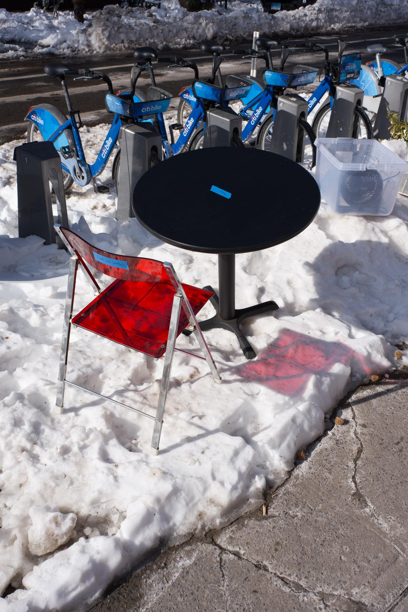 alt cool but broken a red translucent chair with a crack in it filters red light onto the snow. it’s at a black table near a citibike rack cool but broken a red translucent chair with a crack in it filters red light onto the snow. it’s at a black table near a citibike rack