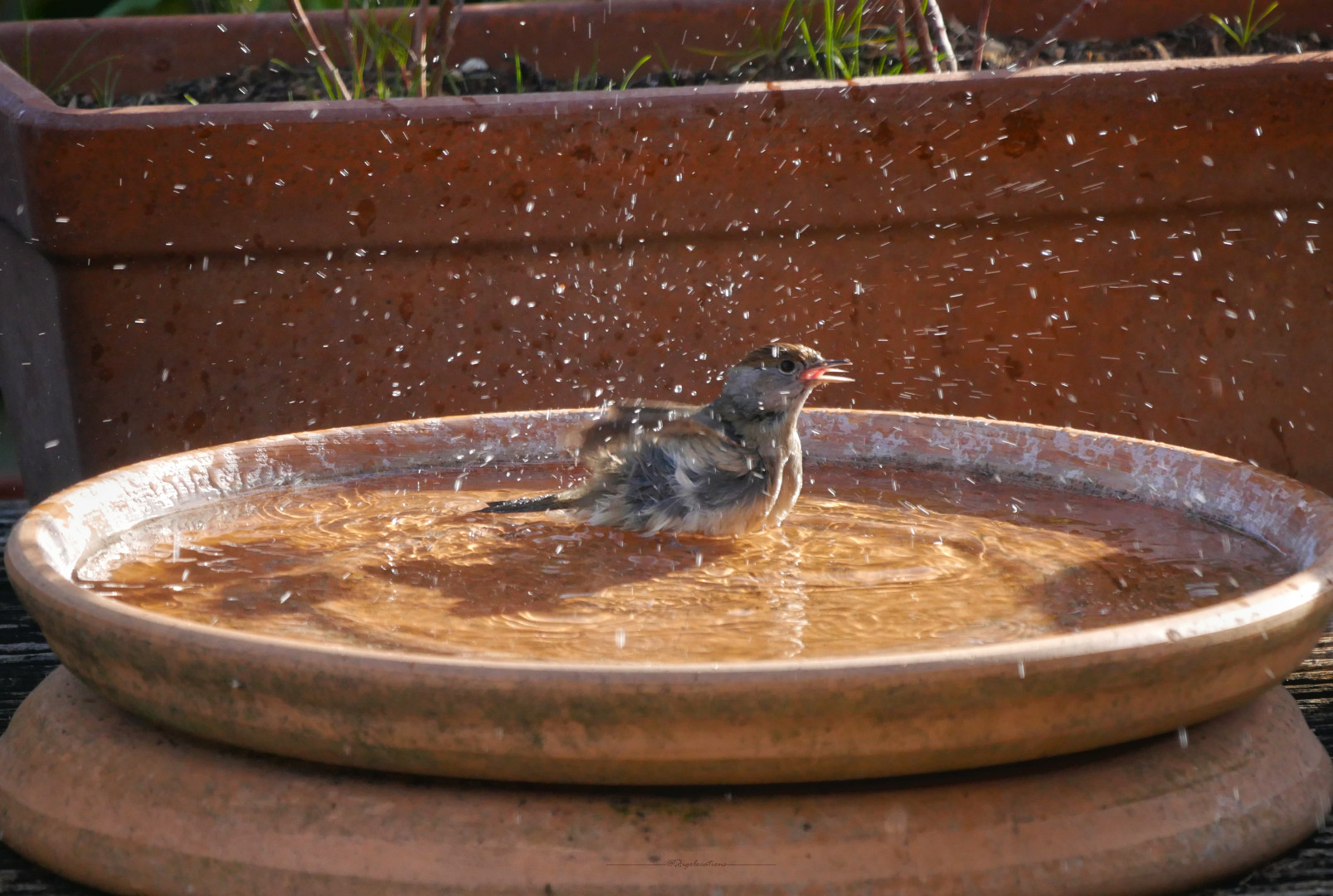 Une fauvette à tête noire femelle en pleine baignade, elle a un air stupéfait sur cette photo qui me fait rire ^^
