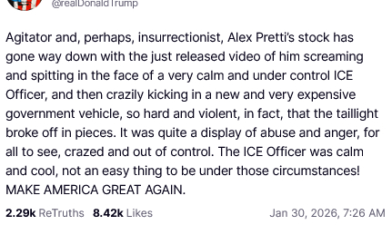 Agitator and, perhaps, insurrectionist, Alex Pretti’s stock has gone way down with the just released video of him screaming and spitting in the face of a very calm and under control ICE Officer, and then crazily kicking in a new and very expensive government vehicle, so hard and violent, in fact, that the taillight broke off in pieces. It was quite a display of abuse and anger, for all to see, crazed and out of control. The ICE Officer was calm and cool, not an easy thing to be under those circumstances! MAKE AMERICA GREAT AGAIN.