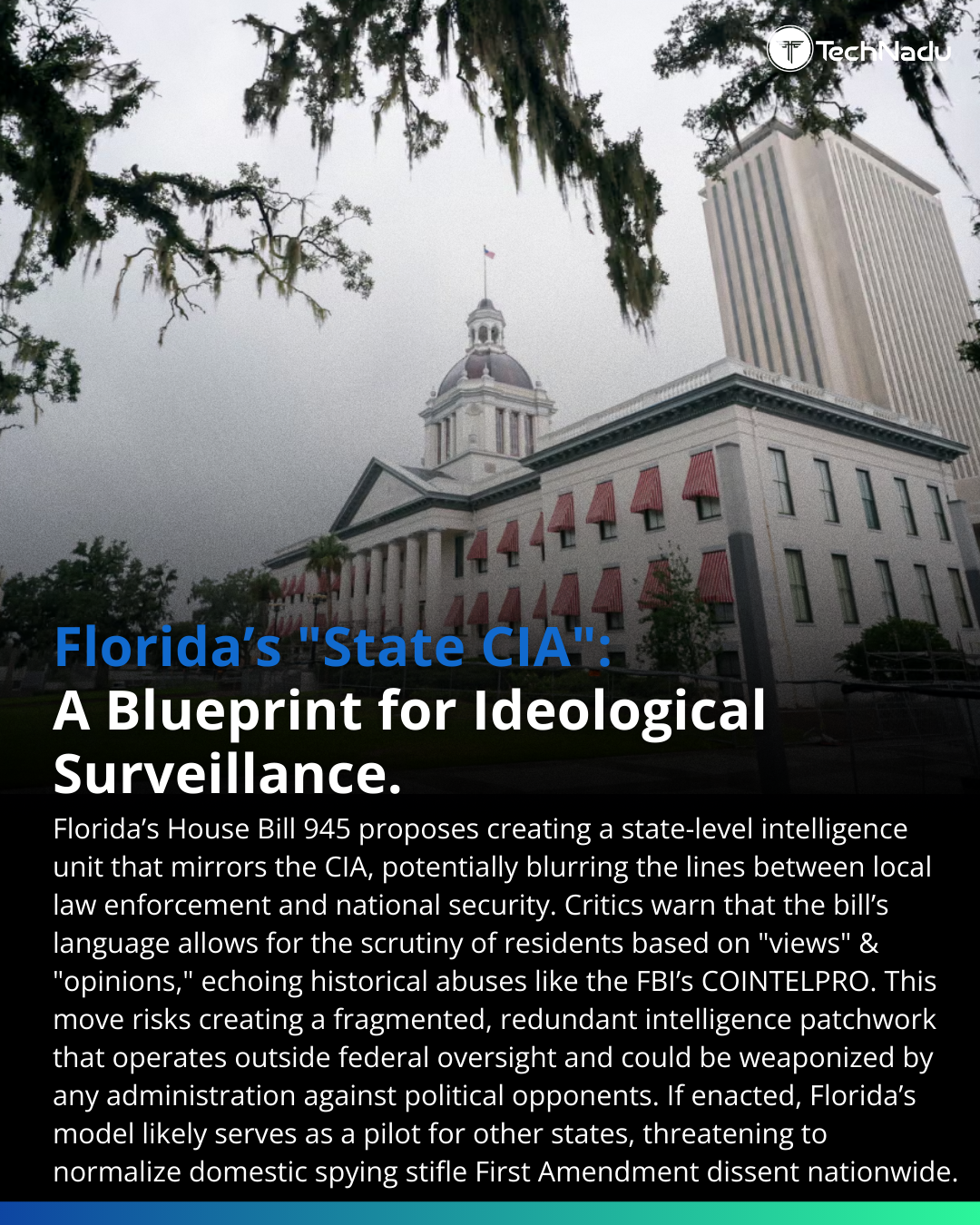 Florida’s proposed HB 945 would establish a state-level operational intelligence unit with authority extending into threat identification and counterintelligence.