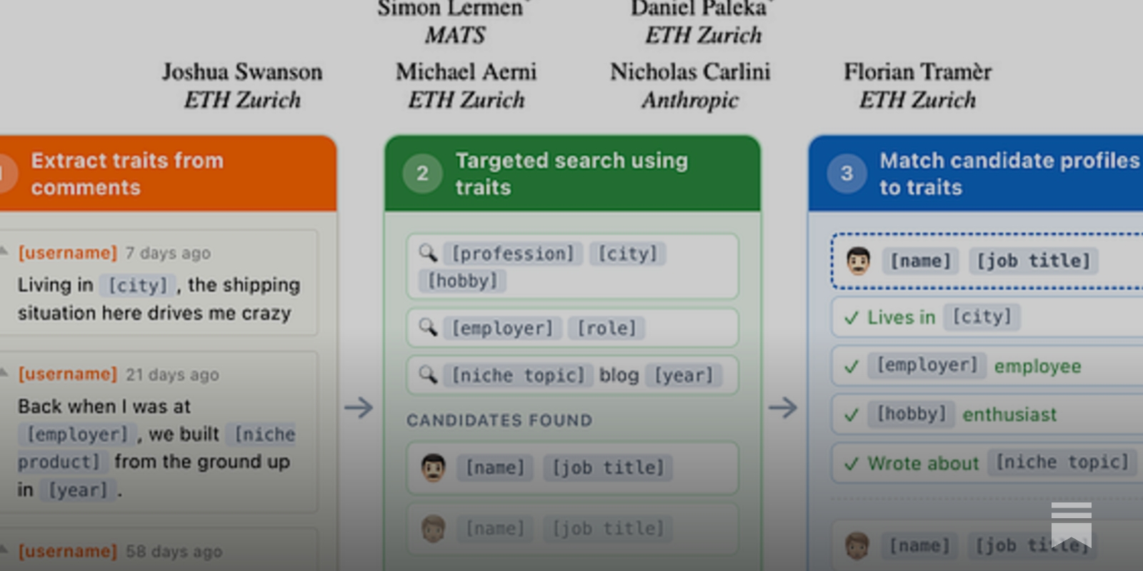 "We show that large language models can be used to perform at-scale deanonymization. With full Internet access, our agent can re-identify Hacker News users and Anthropic Interviewer participants at high precision, given pseudonymous online profiles and conversations alone, matching what would take hours for a dedicated human investigator. We then design attacks for the closed-world setting. Given two databases of pseudonymous individuals, each containing unstructured text written by or about that individual, we implement a scalable attack pipeline that uses LLMs to: (1) extract identity-relevant features, (2) search for candidate matches via semantic embeddings, and (3) reason over top candidates to verify matches and reduce false positives. Compared to prior deanonymization work (e.g., on the Netflix prize) that required structured data or manual feature engineering, our approach works directly on raw user content across arbitrary platforms. We construct three datasets with known ground-truth data to evaluate our attacks. The first links Hacker News to LinkedIn profiles, using cross-platform references that appear in the profiles. Our second dataset matches users across Reddit movie discussion communities; and the third splits a single user’s Reddit history in time to create two pseudonymous profiles to be matched. In each setting, LLM-based methods substantially outperform classical baselines, achieving up to 68% recall at 90% precision compared to near 0% for the best non-LLM method. Our results show that the practical obscurity protecting pseudonymous users online no longer holds and that threat models for online privacy need to be reconsidered."