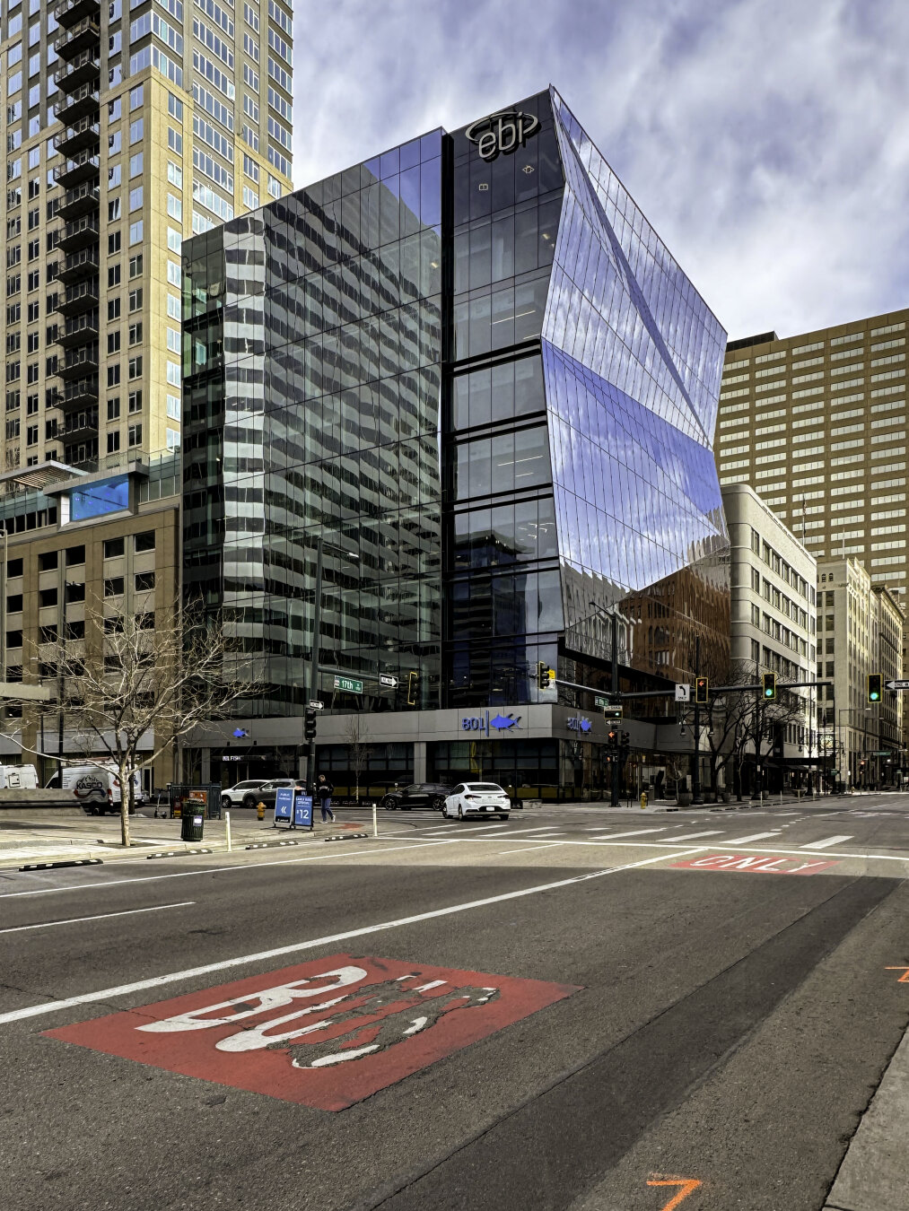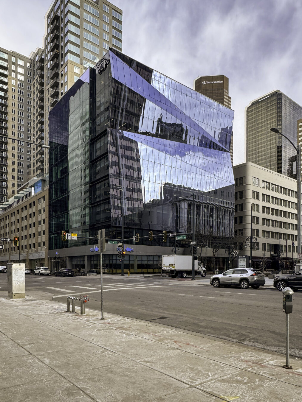 The Prism Building in downtown Denver has a folded glass curtain wall that reflects the sun, sky, and nearby buildings in an ever-changing way during the course of the day and as you look at it from different angles.