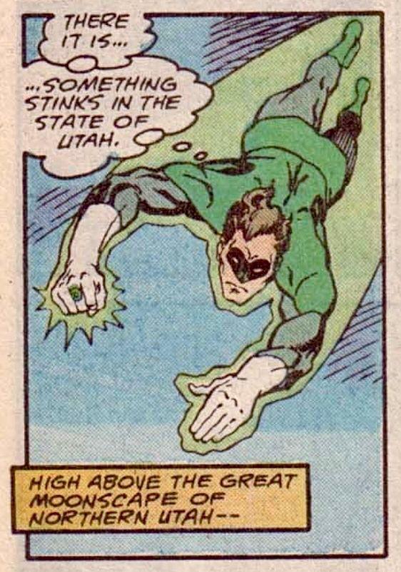 alt Green Lantern (Hal Jordan) may for once not ruining everything as he’s flying downward from the sky as he thinks, “There it is…something stinks in the state of Utah.” at the bottom is narration: “High above the great moonscape of northern Utah – –“ Green Lantern (Hal Jordan) may for once not ruining everything as he’s flying downward from the sky as he thinks, “There it is…something stinks in the state of Utah.” at the bottom is narration: “High above the great moonscape of northern Utah – –“